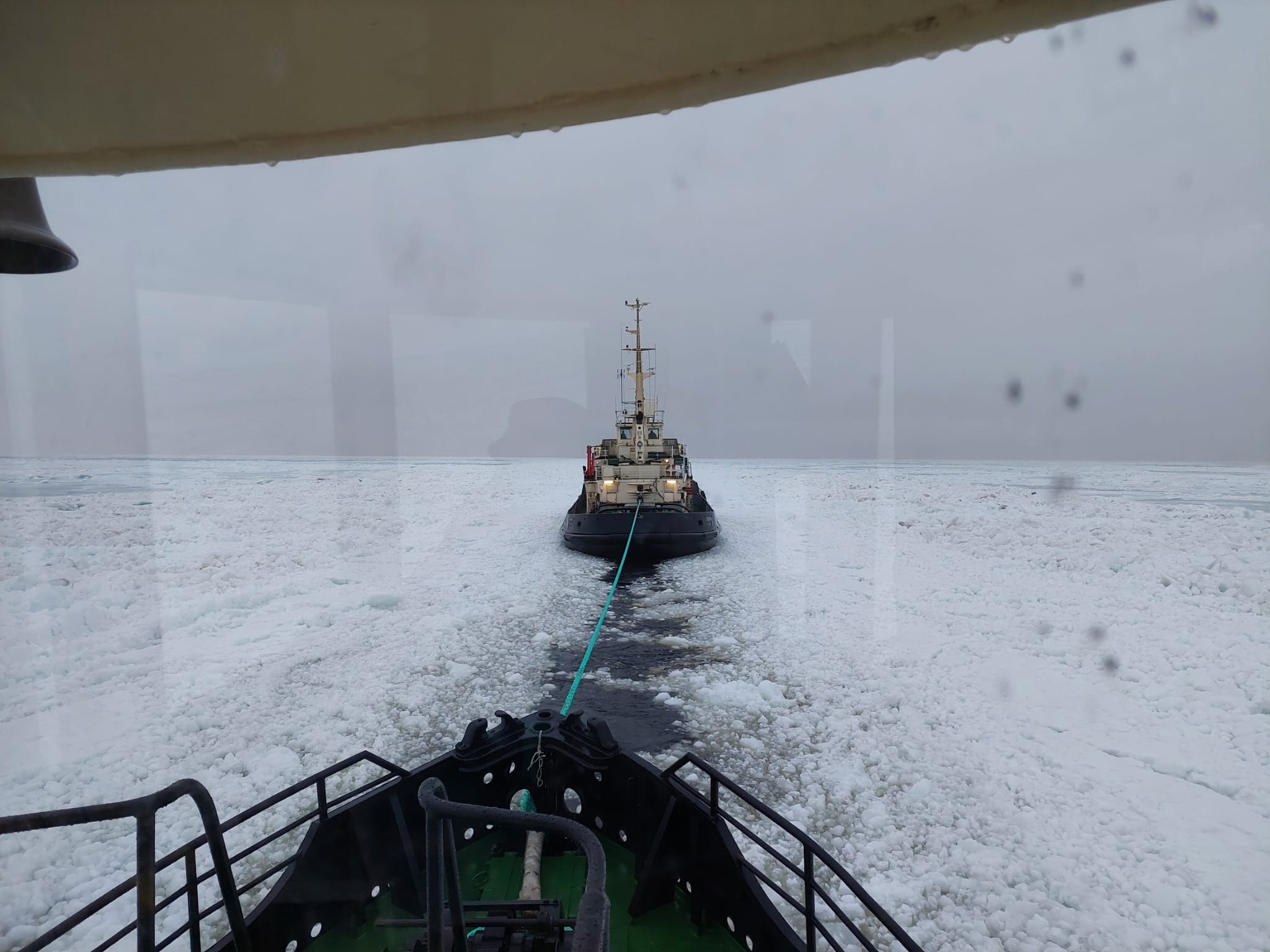 Hinauksessa oleminen oli melkoinen yllätys. Onneksi meillä oli kokenut merimies hinauksen ajan apuna ruorissa. Hänen ohjeidensa mukaan pyöritimme ruoria neljän miehen voimin muutamia minuutteja kerrallaan. Voin sanoa, että kävi melkoisesta kuntoilusta, joka ukolla hiki virtasi ja lihakset olivat maitohapoilla aika pian. Kulku jäissä oli mahtava kokemus, unohtumaton. Pahimmillaan ahtojäissä meneminen oli kuin olisi ollut isossa kattilassa kohtuullisen löysässä mannapuurossa. Asia voisi kuvailla siten että vetelee lusikkaa puuron läpi ja samalla perästä puuro menee umpeen.